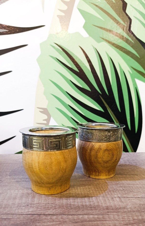 Mate de Algarrobo pulido seleccionado con virola y brazalete de Alpaca labrada