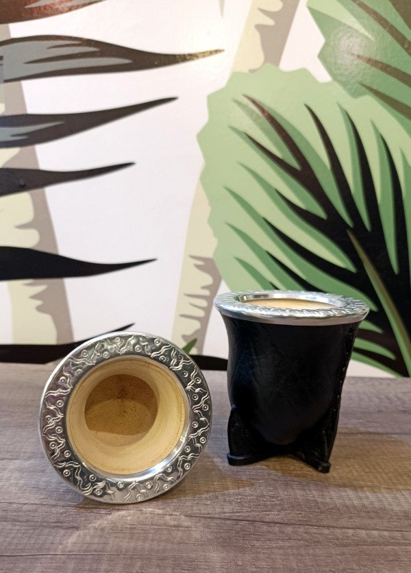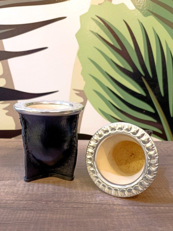 Mate de Calabaza forrado en Cuero. Con virola de aluminio cincelada y base reforzada.